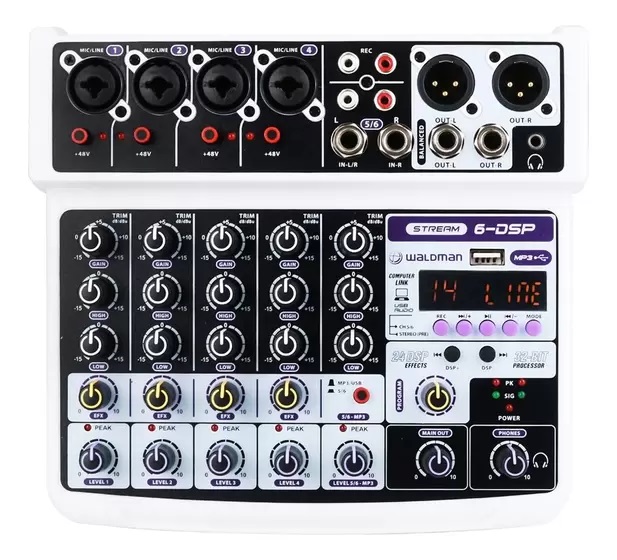 A mesa de som ST-6DSP da Waldman é um mixer de 6 canais que busca atender a necessidade de profissionais de produção de música em home studio, webcast, apresentações musicais entre outras necessidades.