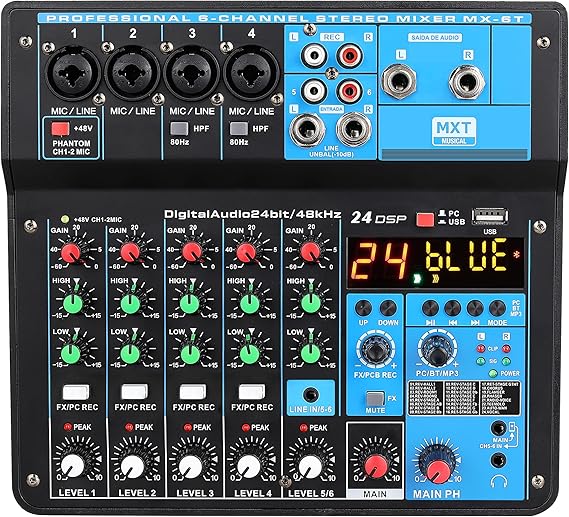 A MX-6T é uma mesa de som de 6 canais combinado com placa de som digital, possui função loopback flexível, perfeita para gravação e webcast e interfaces combinadas de entrada/saída (para PC e monitoração via fone de ouvido). Essa mesa portátil também conta com tecnologia Bluetooth, visor display, módulo MP3, Pen drive, interface USB, 24 efeitos pré-programados e possui a disponibilidade de gravação direta no PC ou Pen drive. Esse equipamento é destinado para quem precisa ter o controle de microfones, instrumentos, DVD player em um só lugar e com dar saída para um computador, uma caixa de som, um gravador e até mesmo para outra interface de áudio.